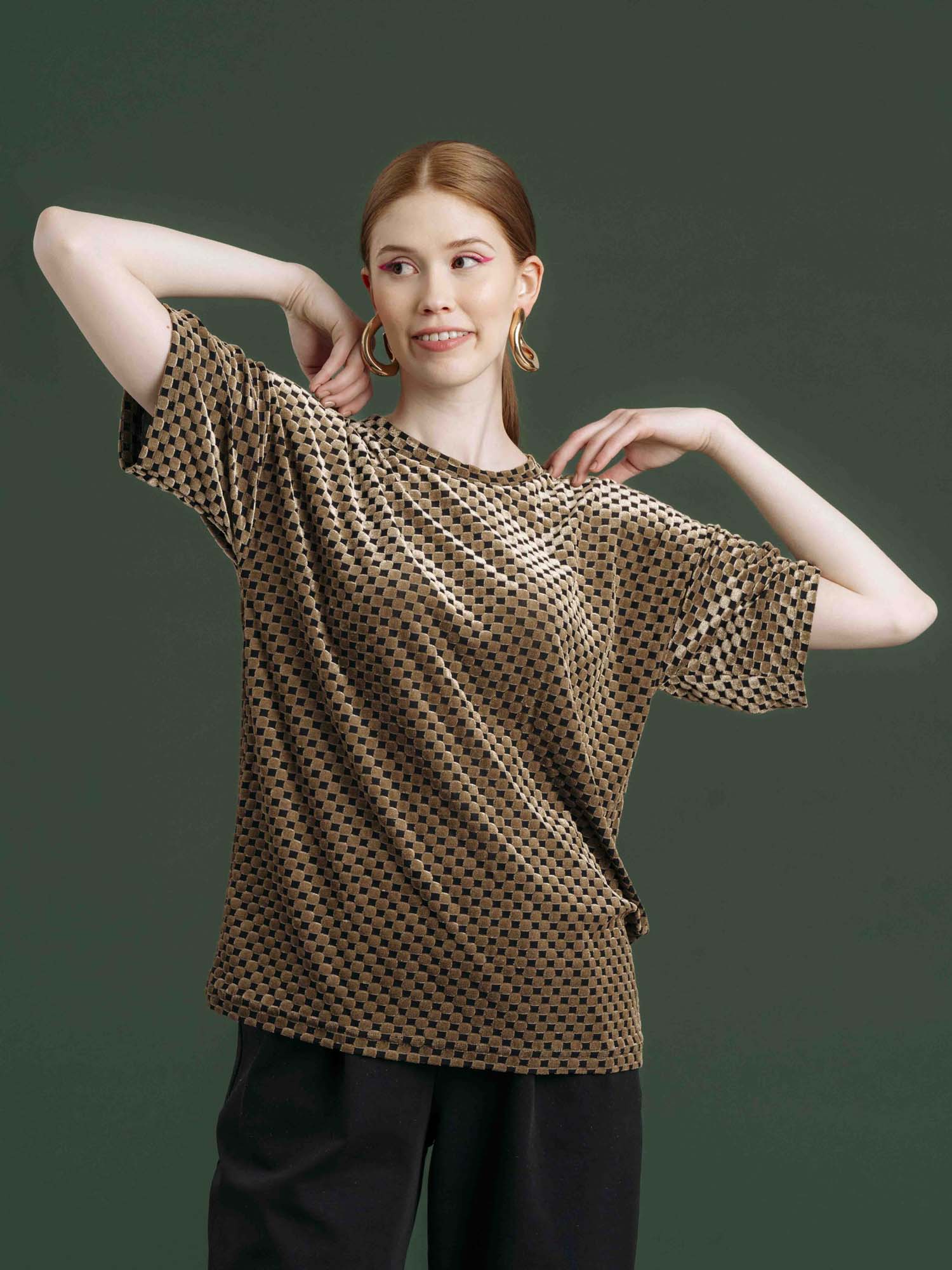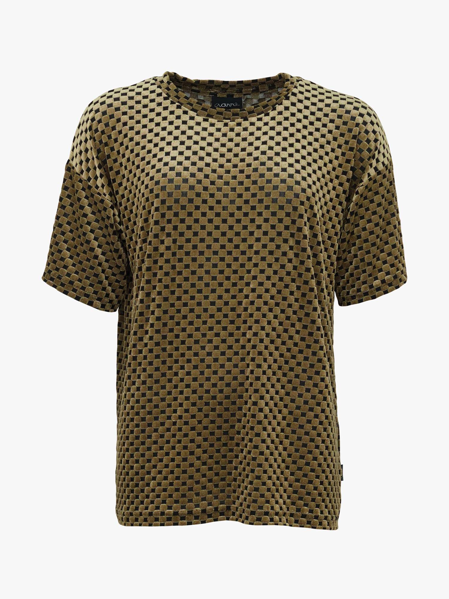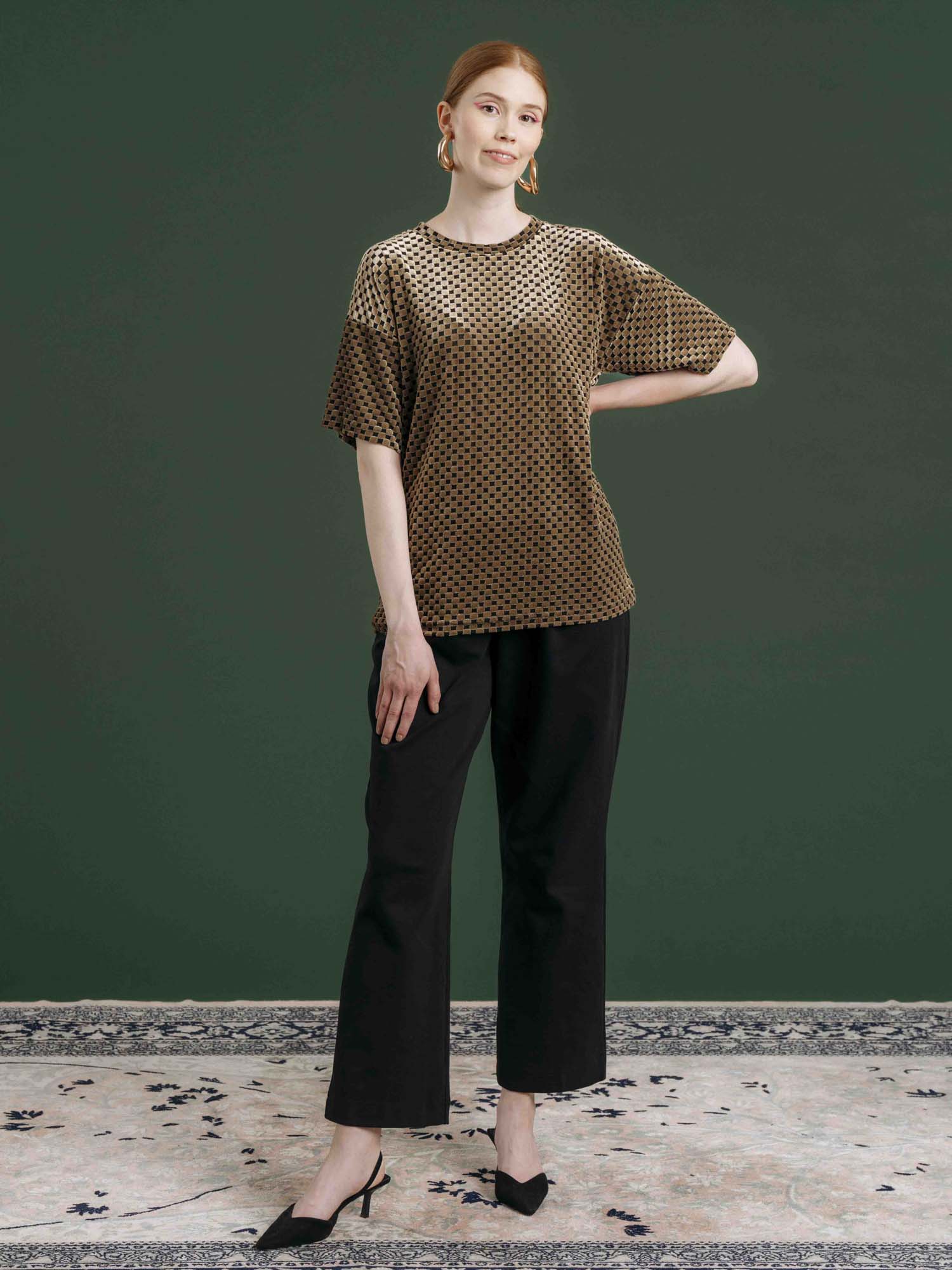 Naisten lyhythihainen, juhlava Taika t-paita on valmistettu kullansävyisestä, joustavasta Chess -jakardineuloksesta. Ruudullisen neuloksen kullanväriset ruudut ovat pehmeää velouria ja mustat ruudut aavistuksen läpikuultavaa joustoneulosta. Rento oversize-t-paita, joka tuo juhlavuutta asuusi ja on samalla kuitenkin mukava päällä! Laatikkomainen, väljä malli, jossa pyöreä pääntie ja lyhyet hihat.