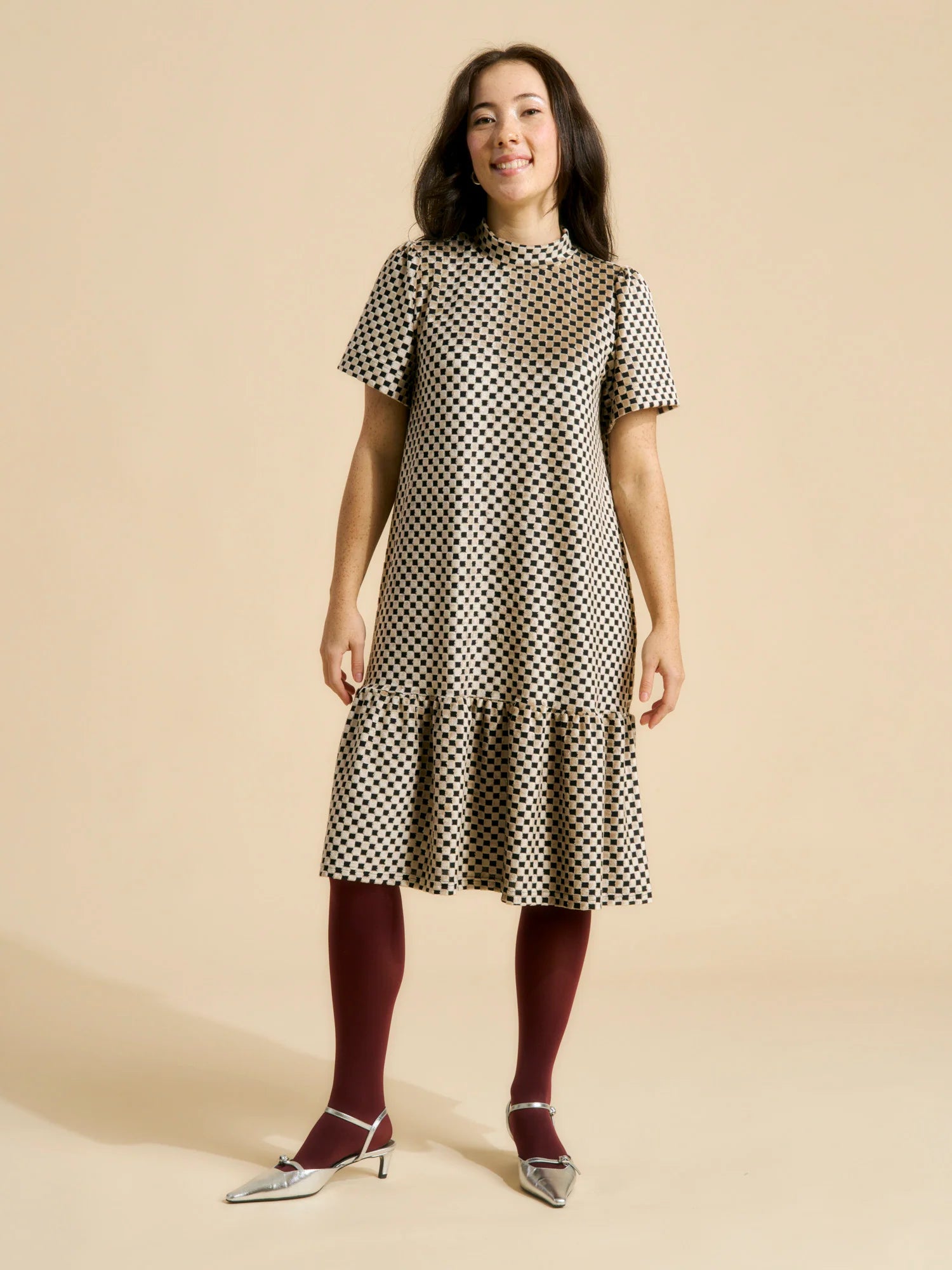 Hohtava, A-linjainen Montana mekko on tilaisuuksien valopilkku! Mekko on valmistettu juhlavasta Chess -jakardineuloksesta, joka laskeutuu kauniisti. Kankaassa on himmeästi hohtavia velour-ruutuja mustalla pohjalla. Montana-mekko on näyttävä ja samalla mukava valinta esimerkiksi illallistreffeille tai juhlaan, sekä aina kun kaipaat hieman lisähohdetta päivääsi! Mekossa on lyhyet hihat, matala poolokaulus ja runsas frillahelma. Niskassa nappikiinnitys kahdella mustalla muovinapilla.