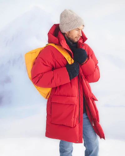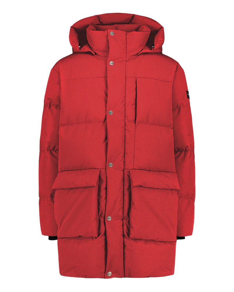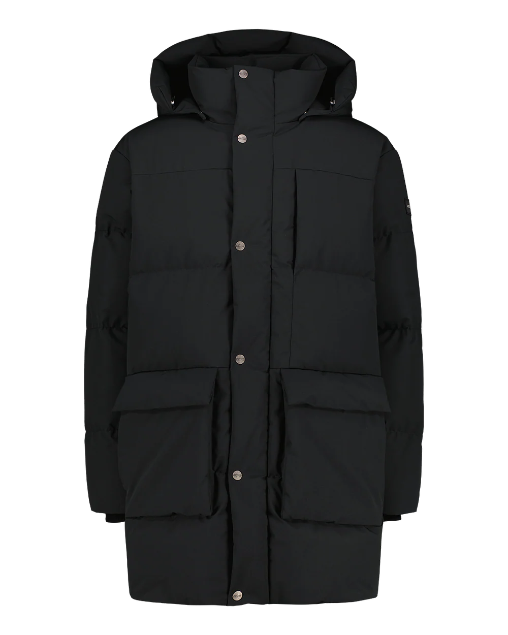 Parkan reilu pituus, suoralinjainen leikkaus ja maskuliininen muoto tuovat ryhtiä – käytännöllisyyttä lisäävät kahdesta suunnasta avattavat päällitaskut, iso povitasku ja irrotettava huppu suojaavalla myrskyreunuksella. Näkyvät metallinapit viimeistelevät kokonaisuuden.