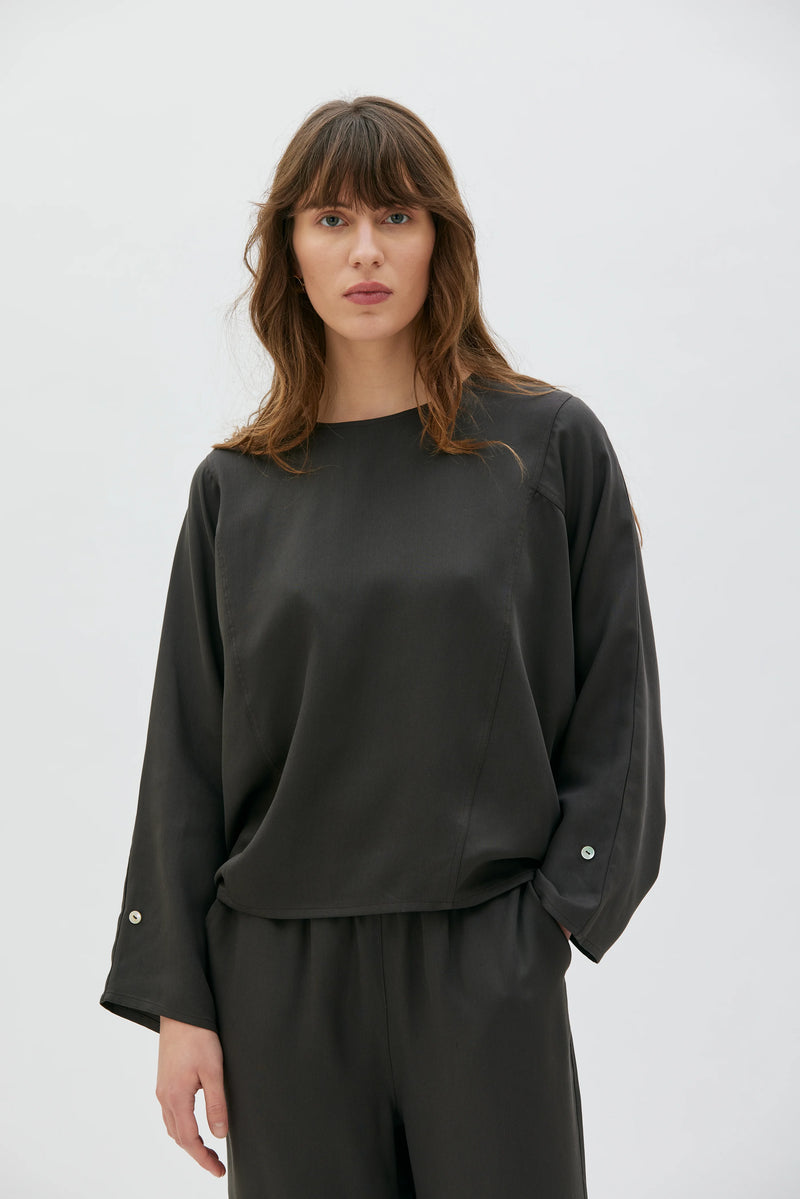 Tämä Zero Waste- pusero yhdistää vaivattoman tyylin ja kestävän kehityksen. Laatikkomaisella istuvuudella, pitkillä kimonohihoilla ja pyöreällä pääntiellä varustettu pusero on valmistettu 100 % keskipaksusta lyocell-twillistä, joka tunnetaan pehmeästä laskeutumisestaan ja hienovaraisesta kiillostaan.