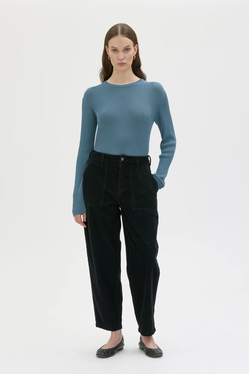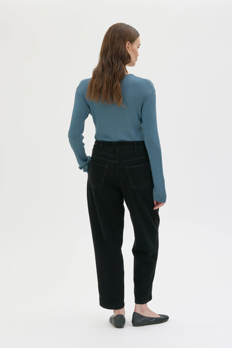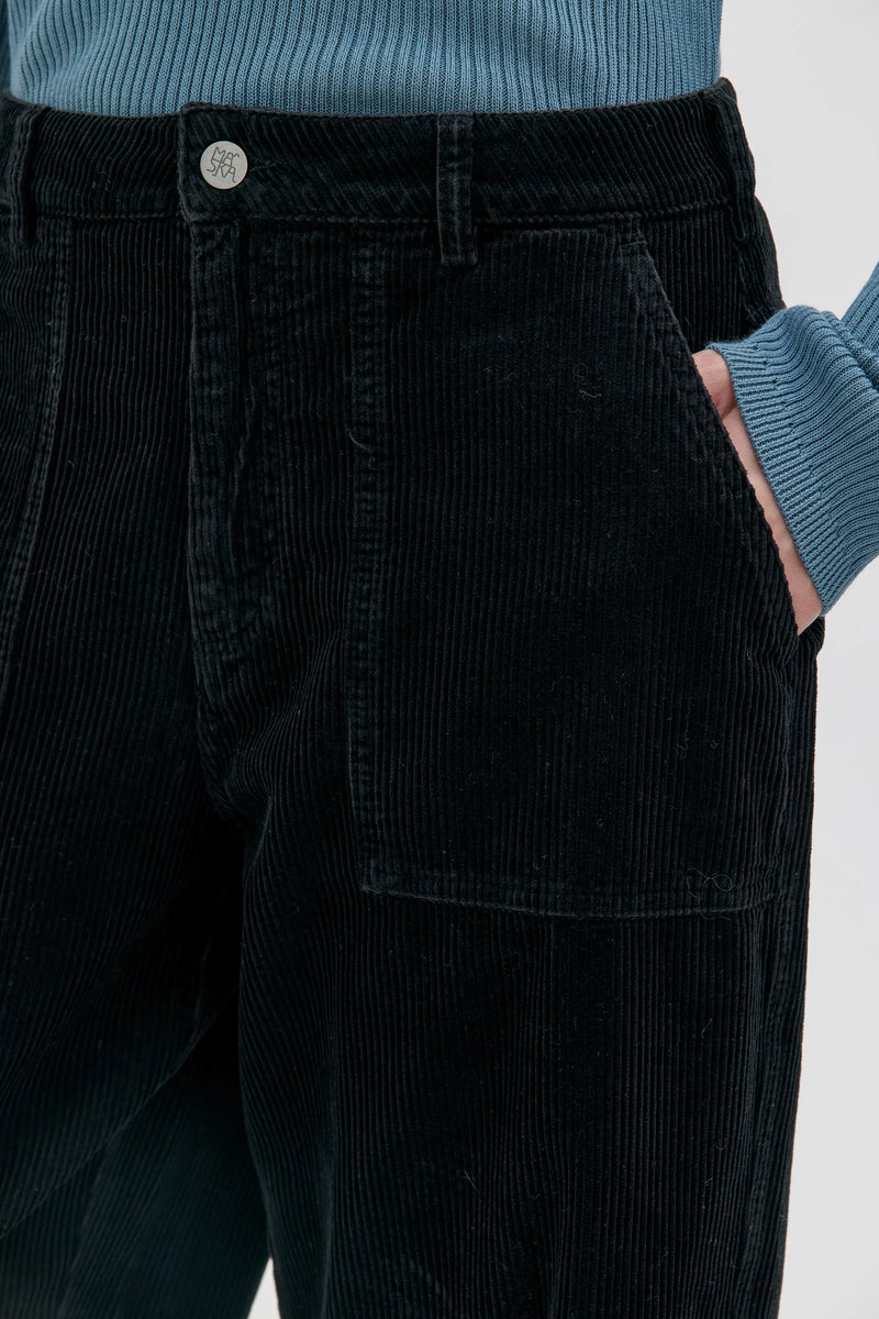Tynnyrimalliset Samettihousut, joissa kaksi isoa etutaskua ja klassiset takataskut. Sävysävyyn tikkaukset yläosassa. Normaali vyötärö, reilu istuvuus ja kapenevat lahkeensuut. Takalahkeen sauma lisää volyymia.