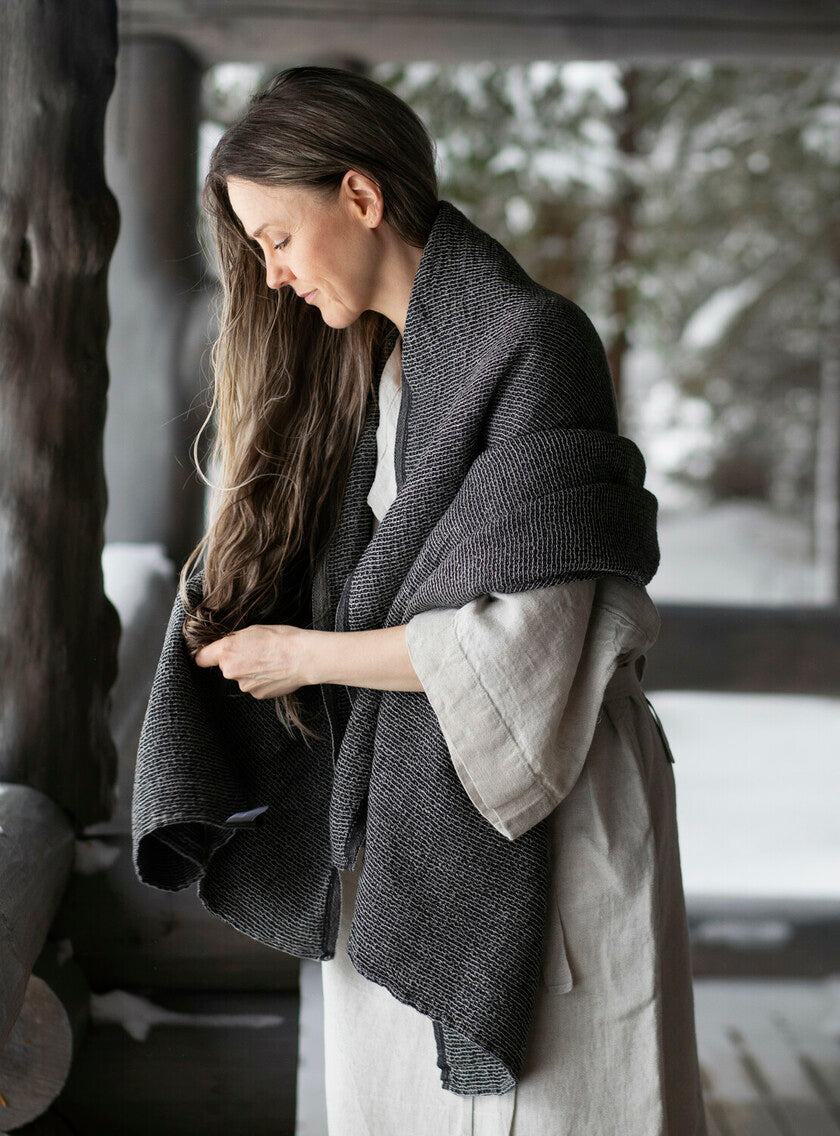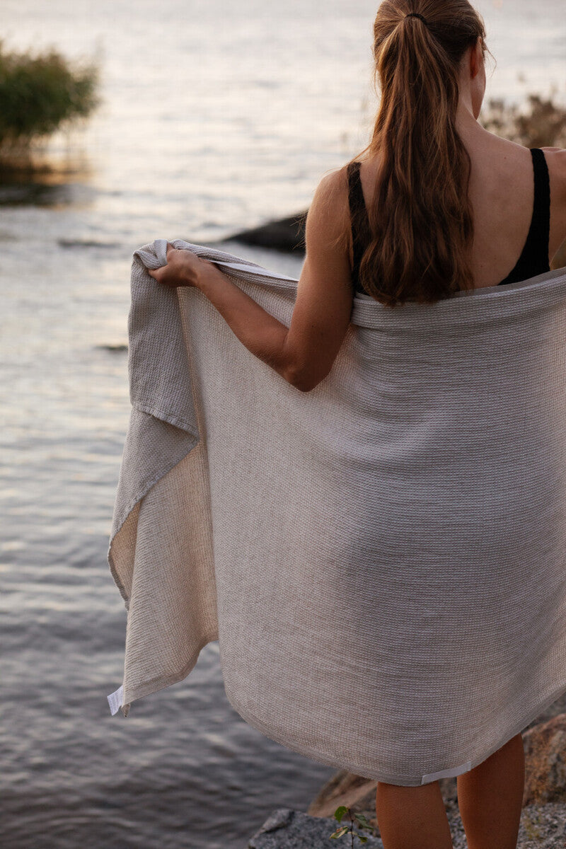 Pellava-tencel-pyyhe on ehdottomasti yksi parhaista kumppaneista myös rannalle ja reissuun. Pyyhe on todella imukykyinen ja kevyt. Lisäksi se kuivuu nopeasti ja ehtii kuivahtamaan uintikertojen välillä juuri sopivasti. Jättipyyhkeen päällä mahtuu makoilemaan, ja sen suojissa voi myös pukeutua tarvittaessa. TERVA-pyyhkeet mahtuvat todella pieneen tilaan, joten ne sopivat täydellisesti myös matkapyyhkeiksi.