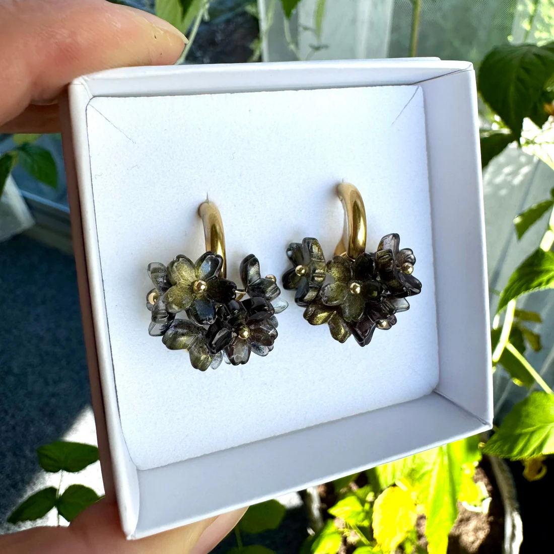 Kauniit ja sirot, lasikukkakorvakorut! Riipusosat on irroitettavat, joten voit pitää myös pelkkiä renkaita.